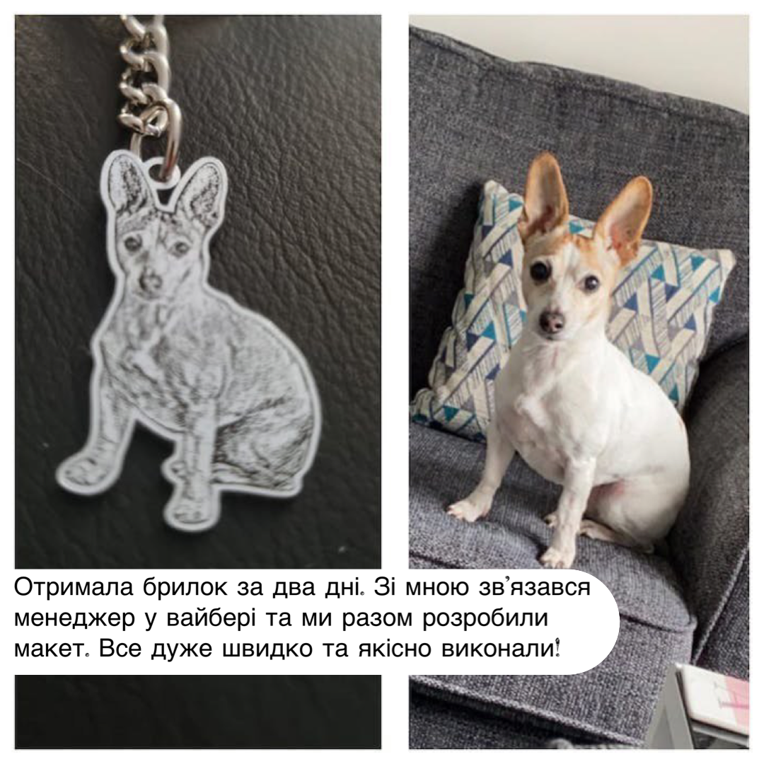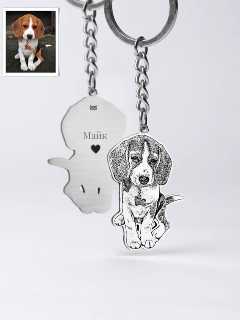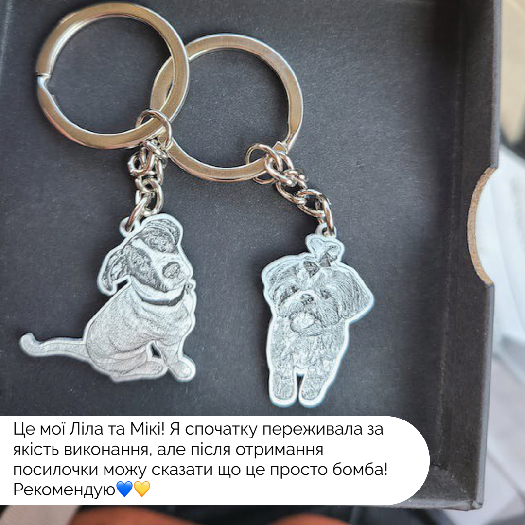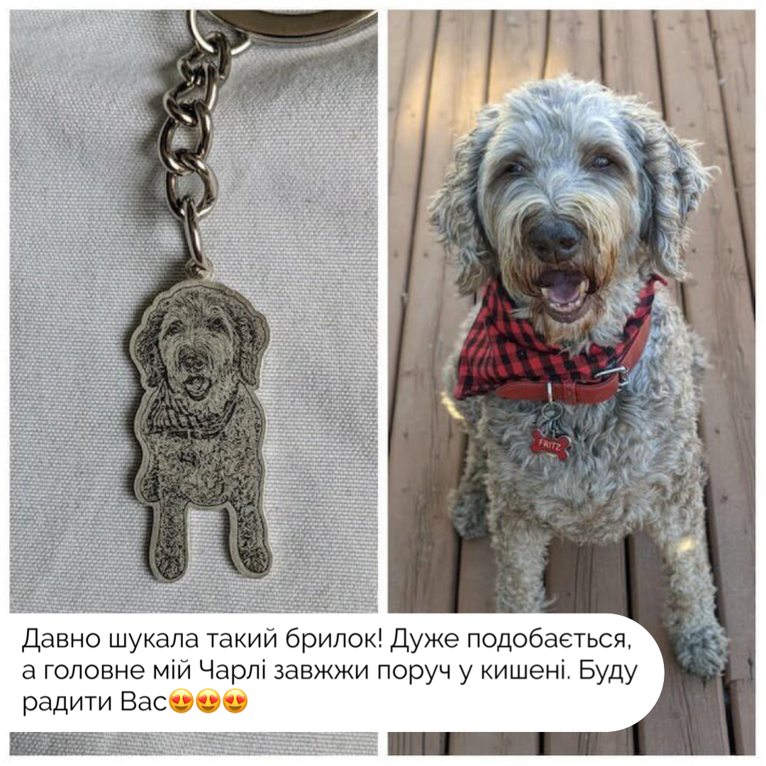 Металевий брелок, вирізаний лазером по контуру вашої тваринки та гравіруванням. Розробимо макет разом з Вами!