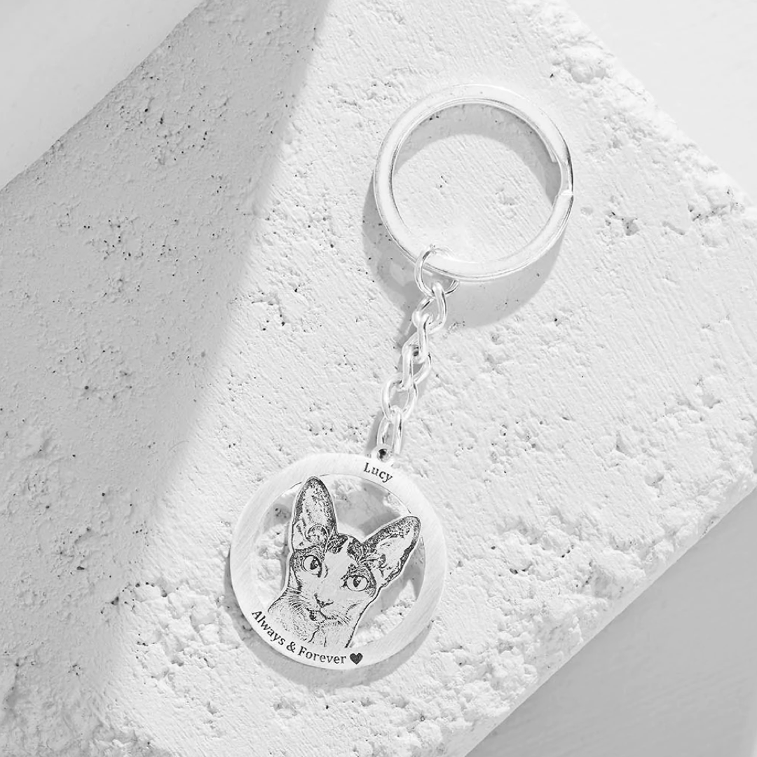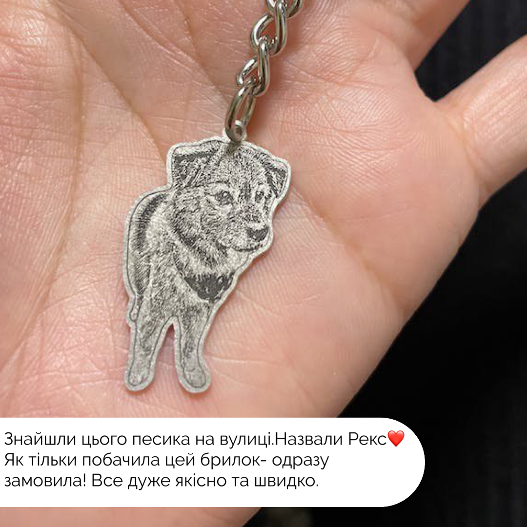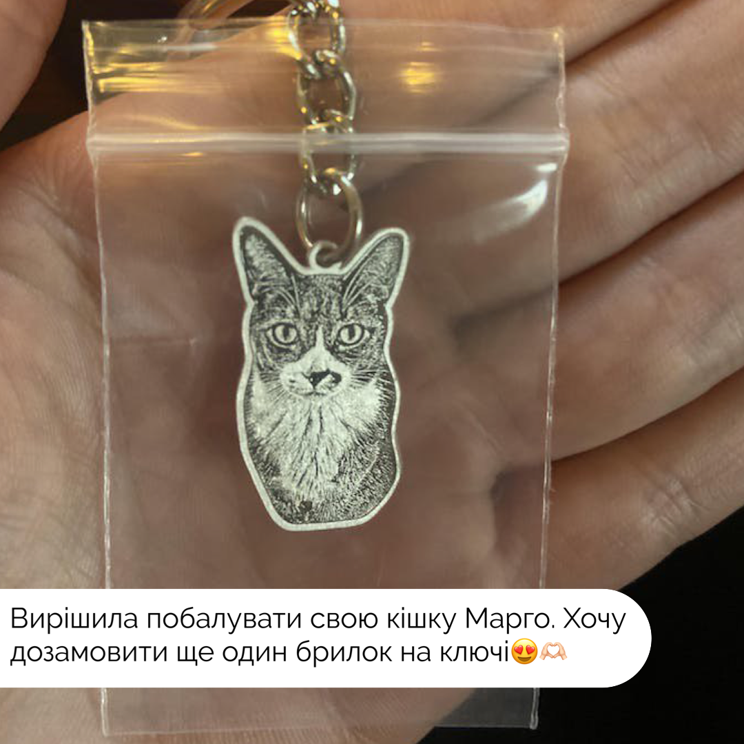 Металевий брелок, вирізаний лазером по контуру вашої тваринки тагравіруванням. Розробимо макет разом з Вами!